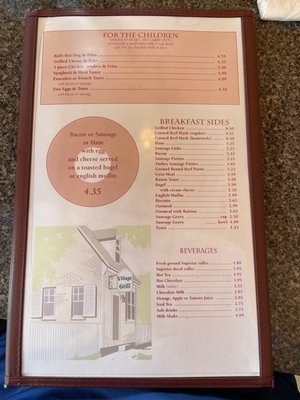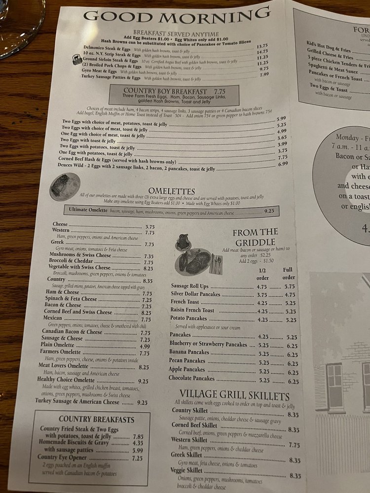 Village Grill offers amenities such as Takeout, Wheelchair Accessible, Good for Kids, Outdoor Dining, Covered Outdoor Dining, Accessible Parking, Accepts Contactless Payments, Takeout, Wheelchair Accessible, Good for Kids, ensuring a comfortable and convenient experience for clients.